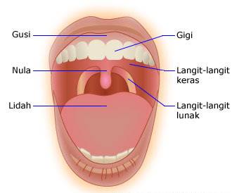 Lidah berfungsi memposisikan makanan agar mudah dikunyah dan membantu makanan untuk ditelan. Gigi berfungsi untuk mengunyah dan memotong makanan agar menjadi lebih halus. Sedangkan kelenjar air liur membantu menelan makanan dengan lebih mudah dan sebagai pelindung rongga mulut.